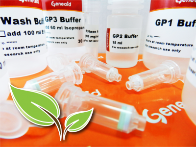The Genomic DNA Mini Kit (Plant) is a genomic DNA extraction kit optimized for genomic, mitochondrial and chloroplast DNA purification from plant tissue. This DNA extraction kit processes plant samples by grinding in liquid nitrogen followed by lysis buffer incubation. The lysate is treated with RNase A then filtered to remove cell debris and salt precipitates. In the presence of the binding buffer, coupled with chaotropic salt, genomic DNA in the lysate binds to the glass fiber matrix of the spin column. Contaminants are removed using a Wash Buffer (containing ethanol) and the purified genomic DNA is eluted by a low salt Elution Buffer, TE or water. DNA phenol extraction or alcohol precipitation is not required, and the entire procedure can be completed in less than 30 minutes. For RNA purification from plant samples, the Total RNA Mini Kit (Plant) is also available.
