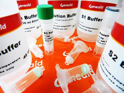 The Presto™ Buccal Swab gDNA Extraction Kit provides an efficient method for purifying DNA (including genomic, mitochondrial and viral DNA) from buccal cells. This DNA Extraction Kit uses Proteinase K and chaotropic salt to lyse cells and degrade protein, allowing DNA to bind to the glass fiber matrix of the spin column. S3 Powder is included with the kit to improve the efficiency of DNA binding to the spin column membrane. Contaminants are removed using W1 Buffer and Wash Buffer (containing ethanol). The purified genomic DNA is eluted by a low salt Elution Buffer, TE or water. High quality genomic DNA can be purified in 20 minutes without phenol/chloroform extraction or alcohol precipitation, with an average DNA yield of 2 ?g per buccal swab. Purified DNA, with approximately 20-30 kb, is suitable for use in PCR or other enzymatic reactions.