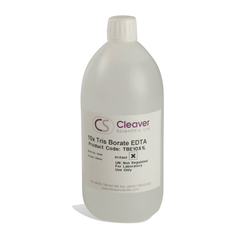 Cleaver Scientific supplies TBE and TAE in powder and liquid form. Both TBE and TAE are widely used to separate nucleic acids in horizontal gel electrophoresis, and occasionally in vertical polyacrylamide gels. TBE has a higher buffering capacity than TAE, which is used for faster separations of linear double-stranded DNA.Cleaver Scientific’s TBE is supplied in a bottle with enough powder to produce 10L of TBE buffer. The buffer may be opened as required and reconstituted in distilled water to make upto 10 litres of working solution. Buffers are also provided as ready-made 50x TAE and 10x TBE solutions in 1 and 4 litre volumes. These are ideal for laboratories running horizontal nucleic acid gels on a daily basis that require off-the-shelf working stock solutions.