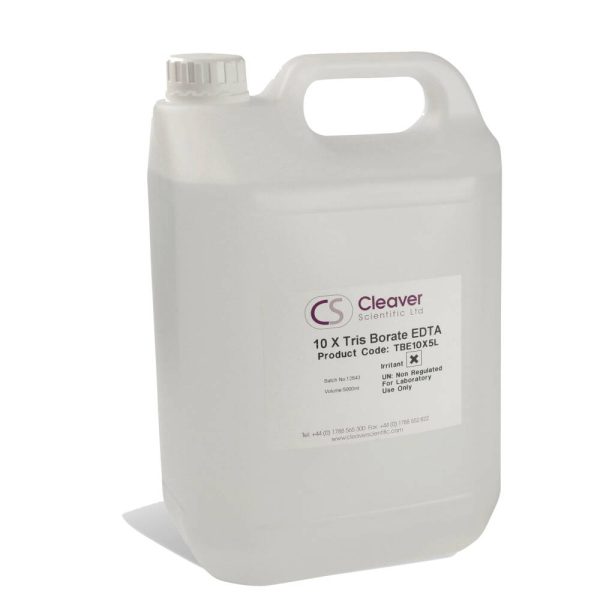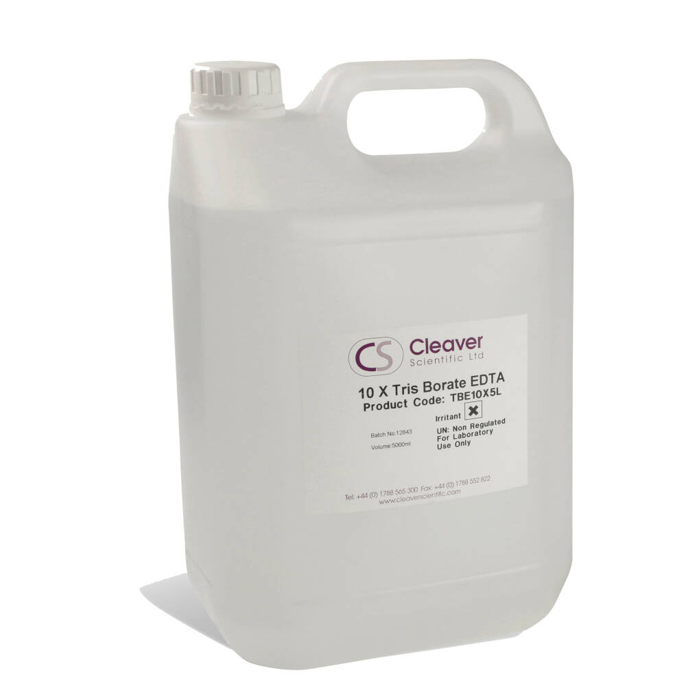 Cleaver Scientific supplies TBE and TAE in powder and liquid form. Both TBE and TAE are widely used to separate nucleic acids in horizontal gel electrophoresis, and occasionally in vertical polyacrylamide gels. TBE has a higher buffering capacity than TAE, which is used for faster separations of linear double-stranded DNA.Cleaver Scientific’s TBE is supplied in a bottle with enough powder to produce 10L of TBE buffer. The buffer may be opened as required and reconstituted in distilled water to make upto 10 litres of working solution. Buffers are also provided as ready-made 50x TAE and 10x TBE solutions in 1 and 4 litre volumes. These are ideal for laboratories running horizontal nucleic acid gels on a daily basis that require off-the-shelf working stock solutions.